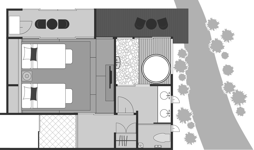 お部屋は10畳の主寝室がメイン。テラスでは中央アルプスの雪解け水、「季の川」がそうそうと流れる音に身をまかせ、駒ヶ根高原の大自然に包まれる気分を味わっていただけます。